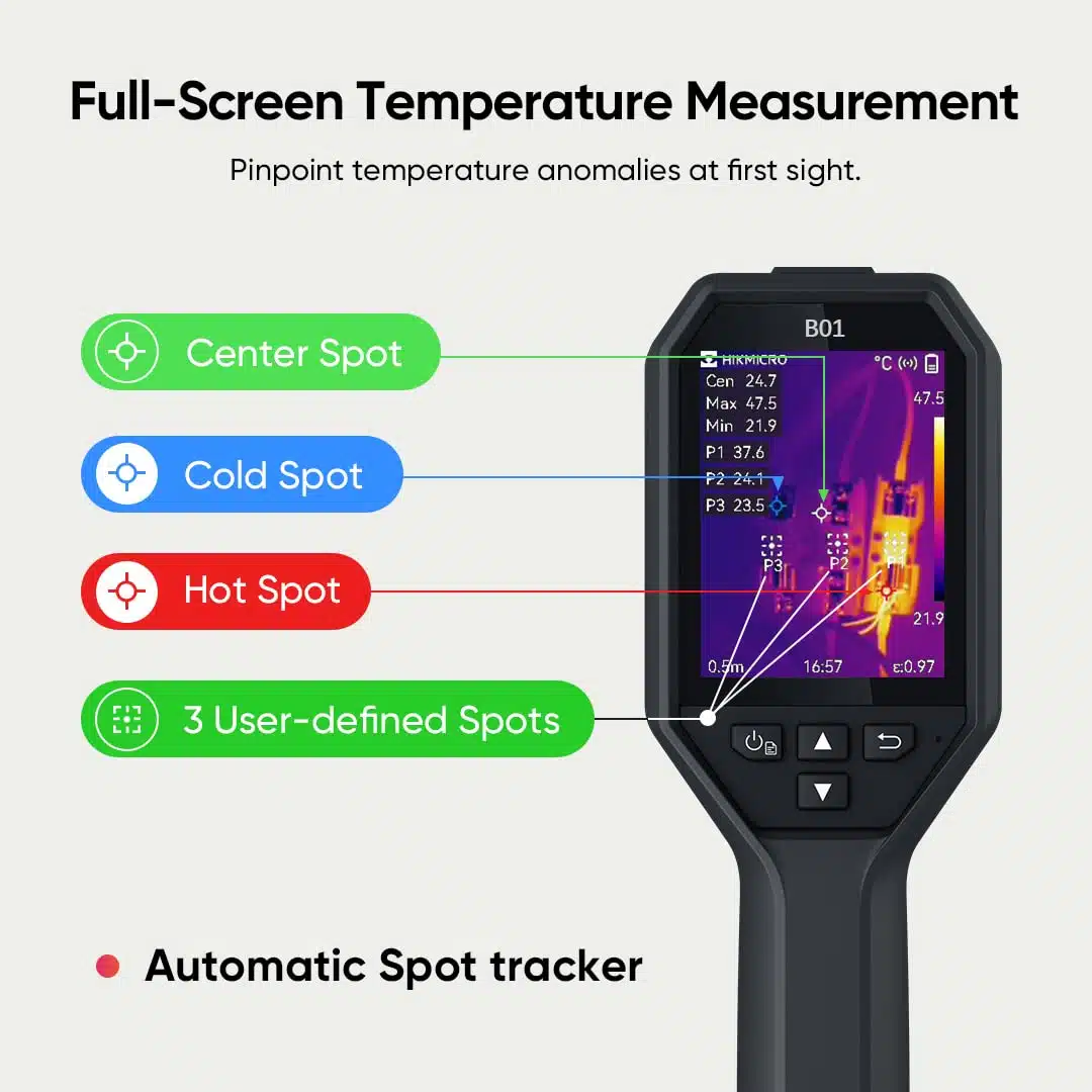 - [Strumento ideale per l’ispezione termica:] La termocamera HIKMICRO B01 è perfetta per le Ispezioni Domestiche, l’Isolamento Mancante, le Perdite d’Aria, le Perdite d’Acqua, la Manutenzione degli Impianti, la Risoluzione dei Problemi HVAC e le Ispezioni professionali per la risoluzione dei problemi elettrici e meccanici.