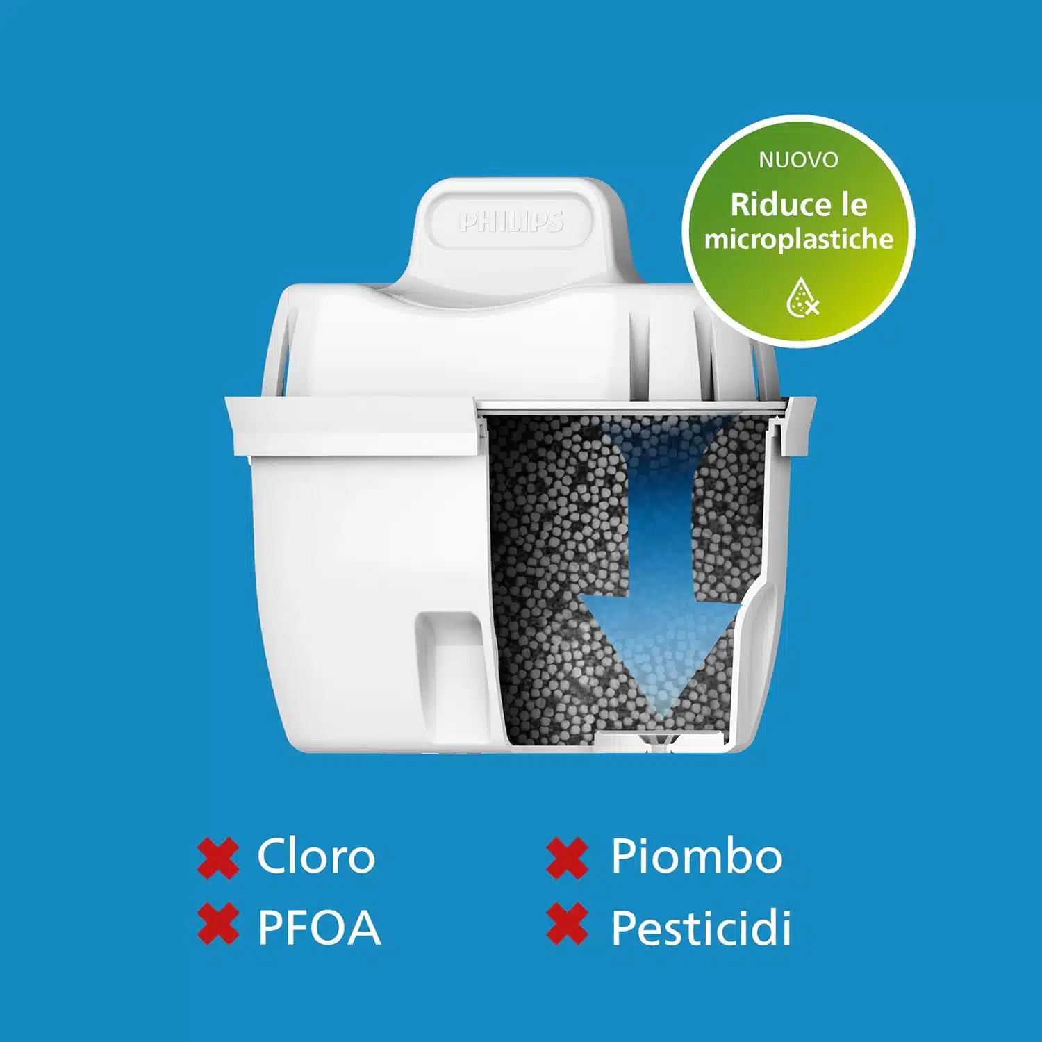 - PHILIPS FILTRO FILTRAZIONE AVANZATA: riduce efficacemente le sostanze nocive come MICROPLASTICI, CLORO, CALCARE, METALLI PESANTI, PFOA e altri contaminanti.