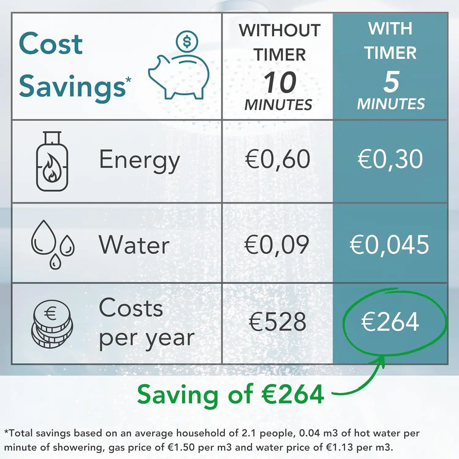 Il consumo di gas durante una doccia media di 10 minuti è di 0,4 m³. Con gli attuali prezzi dell’energia, questo equivale a un risparmio di €0,06 al minuto di doccia. Se una famiglia di 4 persone fa la doccia ogni giorno e dimezza il tempo della doccia da 10 a 5 minuti, si tratta di un risparmio di circa €438 all’anno.